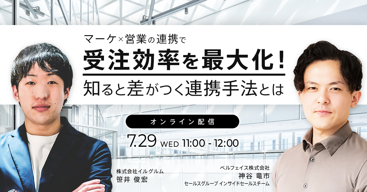 本セミナーでは、Web広告の効果測定でおなじみ「AD EBiS」を提供する株式会社イルグルム様と、オンライン商談システムを提供するベルフェイス株式会社が、営業×マーケティングのシナジーを最大化する連携方法・施策をご紹介します。