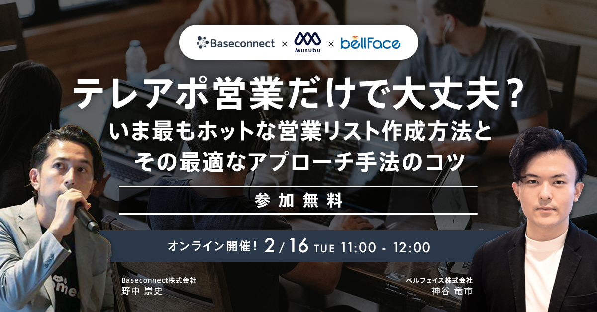 本セミナーでは、いかにして高精度の営業リストを作成するのか、そしてどのように営業の生産性を向上させるのか、法人営業リストをスピーディーに作成できるBaseconnectの「Musubu」と営業リストに対するアプローチを効率化するオンライン営業システムの「ベルフェイス」より実際の事例を交えながらご紹介いたします。