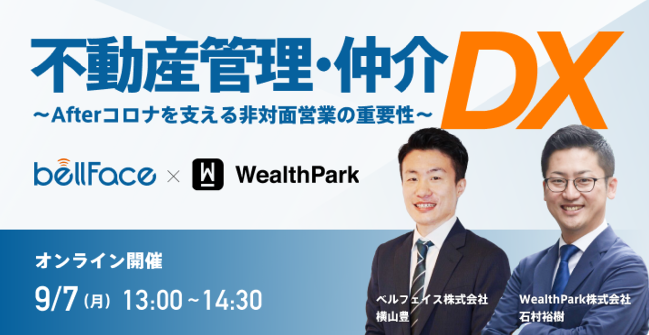 今回は不動産領域における資産運用・管理プラットフォームを、不動産管理会社様向けを中心として展開しているWealthPark株式会社と、ここ数ヶ月で不動産業界での利用が急激に増えているオンライン営業システムを展開しているベルフェイス株式会社の共催で、不動産管理・仲介会社におけるDXの必要性とその全体像について、さらには特に重要でDXの根幹ともなる非対面営業について、これから必要とされる動きや考え方をご説明いたします。