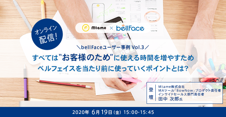 bellFaceユーザー事例は、実際にベルフェイスを導入し活用しているユーザー様に登壇いただき、ツール活用ノウハウを紹介する場です。第3回目となる今回は、マーケティングの力で世の中をもっと楽しく!をモットーに、企業のマーケティング活動における、集客支援、Web制作、リピート施策までの全てを、マーケティングとエンターテインメントを融合させて支援する Mtame株式会社 田中 次郎 氏に登壇いただきます! ベルフェイス導入から利用の習慣化を徹底的に築き上げた「社内浸透施策」や「資料の整備」をはじめ、社内ナレッジを活かして他部門への利用促進や積極的に情報発信することにより全社的にベルフェイスの活用が広まった取り組みを紹介いたします!
