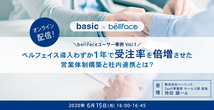 bellFaceユーザー事例は、実際にベルフェイスを導入し活用しているユーザー様に登壇いただき、ツール活用ノウハウを紹介する場として今後定期的に開催をいたします。その記念すべき第1回目は、BtoBマーケティングの効率化を目指すWebマーケティングツール「ferret One」を提供する 株式会社ベーシック 持田 雄一 氏に登壇いただき、ベルフェイス導入から活用までの成功事例をお届けいたします。オンライン商談における課題をいかにして解決へ導き、わずか1年で受注率と受注件数をアップさせた体制づくりや社内連携/浸透の方法を紹介いたします。