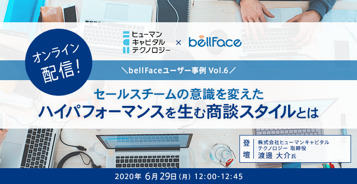 bellFaceユーザー事例は、実際にベルフェイスを導入し活用しているユーザー様に登壇いただき、ツール活用ノウハウを紹介する場です。第6回目となる今回は、テクノロジーにより、一人ひとりの人生を豊かにする働き方を探求し、個人と組織がともに輝く社会を実現するため、従業員のコンディション変化発見ツールを提供する 株式会社ヒューマンキャピタルテクノロジー 渡邊 大介 氏 を招いて、ベルフェイス活用に対するネガティブを取り除き、いかにインサイドセールスが主体的に活用するにまで至ったのかを紹介いたします。さらに、コロナ禍は商談数や受注率にどのような変化をもたらしたのか、どのような取り組みを実施しているのか、リアルな現状をお届けいたします!