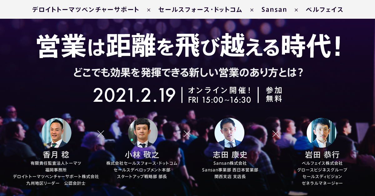 本セミナーは株式会社セールスフォース ・ドットコム社(以下、Salesforce)、Sansan株式会社、デロイトトーマツベンチャーサポート株式会社との共催セミナーとなります。