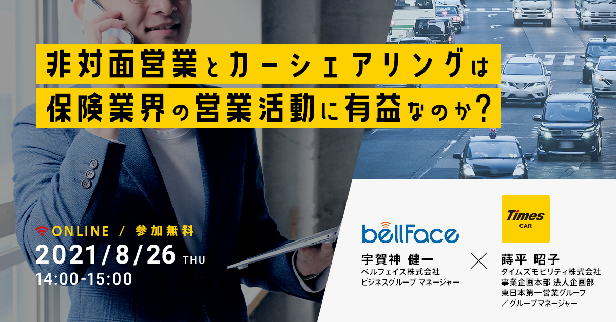 といったような、非対面営業とカーシェアリングに対して抱きがちな疑念について、非対面面談システムを提供するベルフェイス株式会社と、カーシェアリングサービスを展開するタイムズモビリティ株式会社よりお答えします。