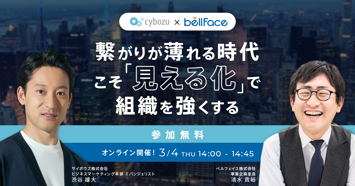 本セミナーでは、リモート✕コミュニケーションに造詣の深いサイボウズとベルフェイスが、「情報の見える化」に取り組む中で見えてきた課題と対処方法を、両社が提供するサービスを交えてお話します。
