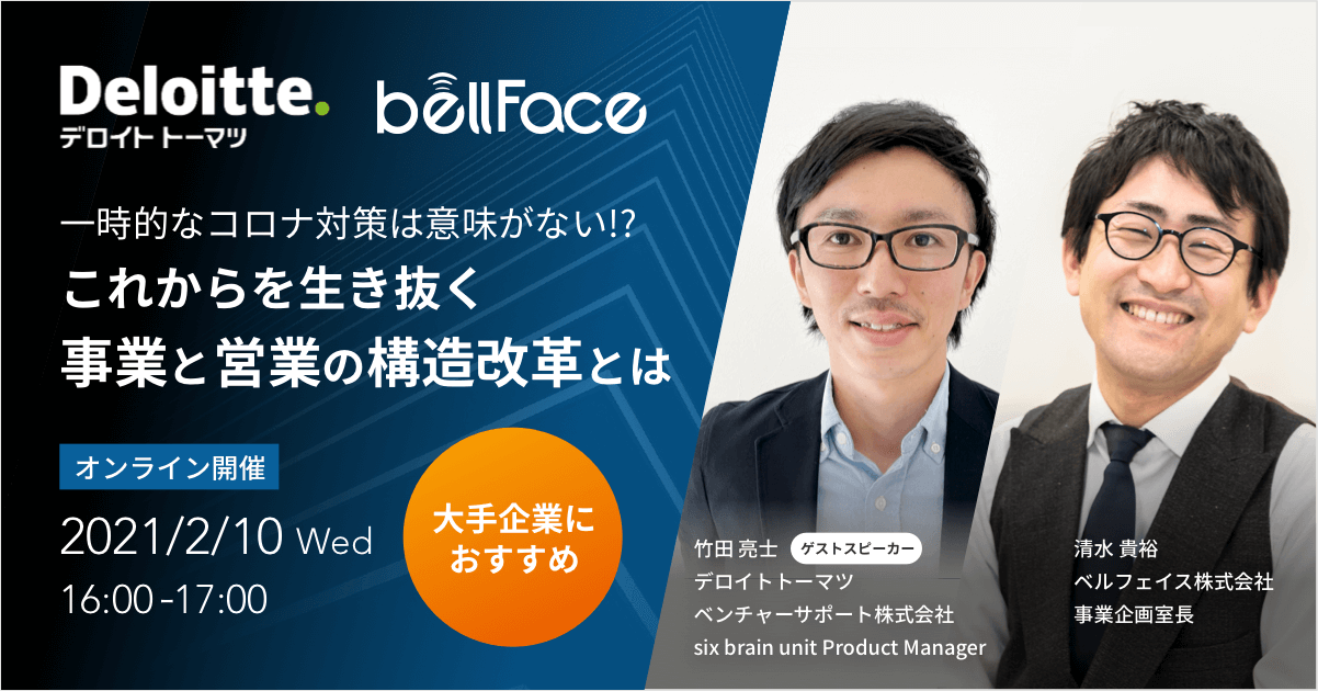 今回は、国内No.1のオンライン営業システム「bellFace」を提供するベルフェイス株式会社より、ゲストスピーカーとして、デロイト トーマツ ベンチャーサポート株式会社の竹田氏をお迎えし、これからを生き抜く「事業」と「営業」の構造改革というテーマで無料ウェビナーを開催いたします。