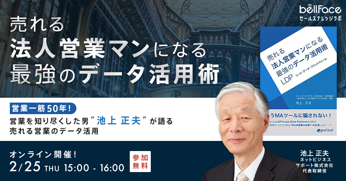 今回は営業50年のキャリアの池上正夫氏より、2020年に出版された「売れる法人営業マンになる最強のデータ活用術」の内容をもとに、売れるBtoB営業になるためのデータ活用について、事例を交えてお話させていただきます。