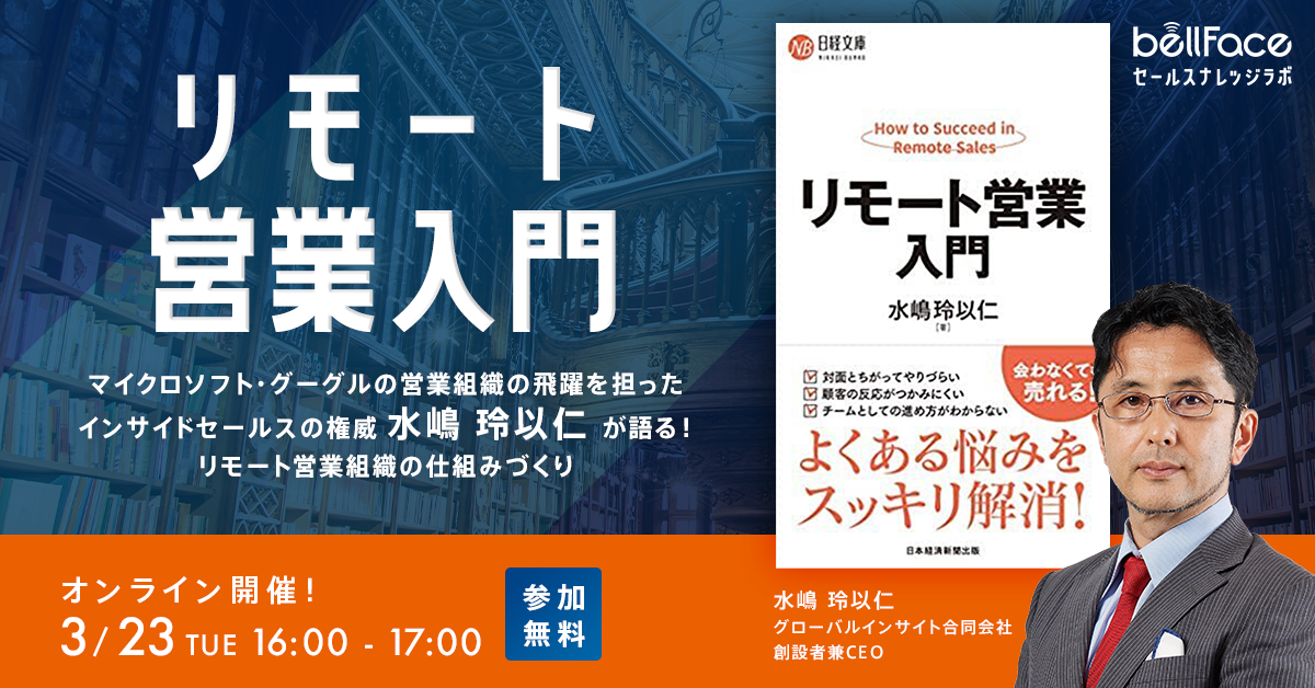 本セミナーではデル、マイクロソフト、グーグルでインサイドセールスの仕組みづくりに携わった水嶋玲以仁氏をお招きし、2020年9月に出版された「リモート営業入門」の内容をもとにご講演いただきます。
